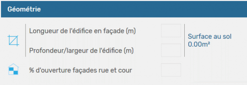 - % d’ouverture sur les façades rue et cour : Cette valeur numérique, en pourcentage, représente le pourcentage de surface constituée de fenêtres et de portes sur les façades du bâtiment. Cette valeur est seulement utilisée pour le calcul du poids propre du bâtiment.