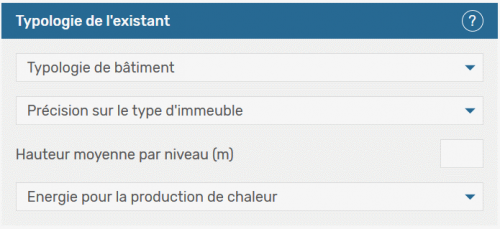 - Typologie de bâtiment : Ce menu déroulant permet de sélectionner, parmi une liste de neuf familles, la typologie de bâtiment, associée à une période de construction du bâtiment entre 1850 à 2000. Les descriptions de bâtiments sont présentées dans la page « les différentes typologies de bâtiments »